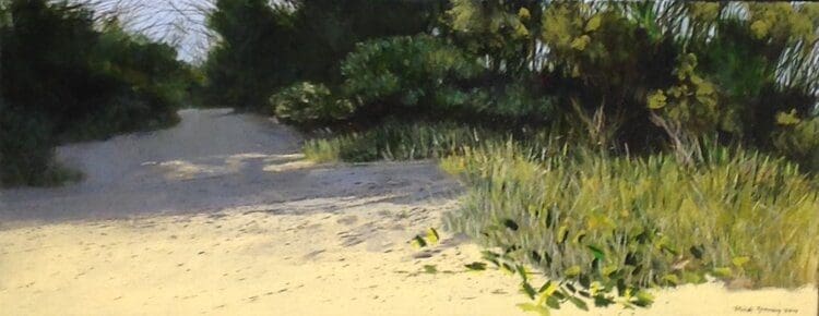 This piece by Nick Young ‘North Stradbroke Island‘ is currently available as part of our Sunshine State 2020 Exhibition. With perfect Winter weather, whale migration in progress, and naturally wonderful scenery.