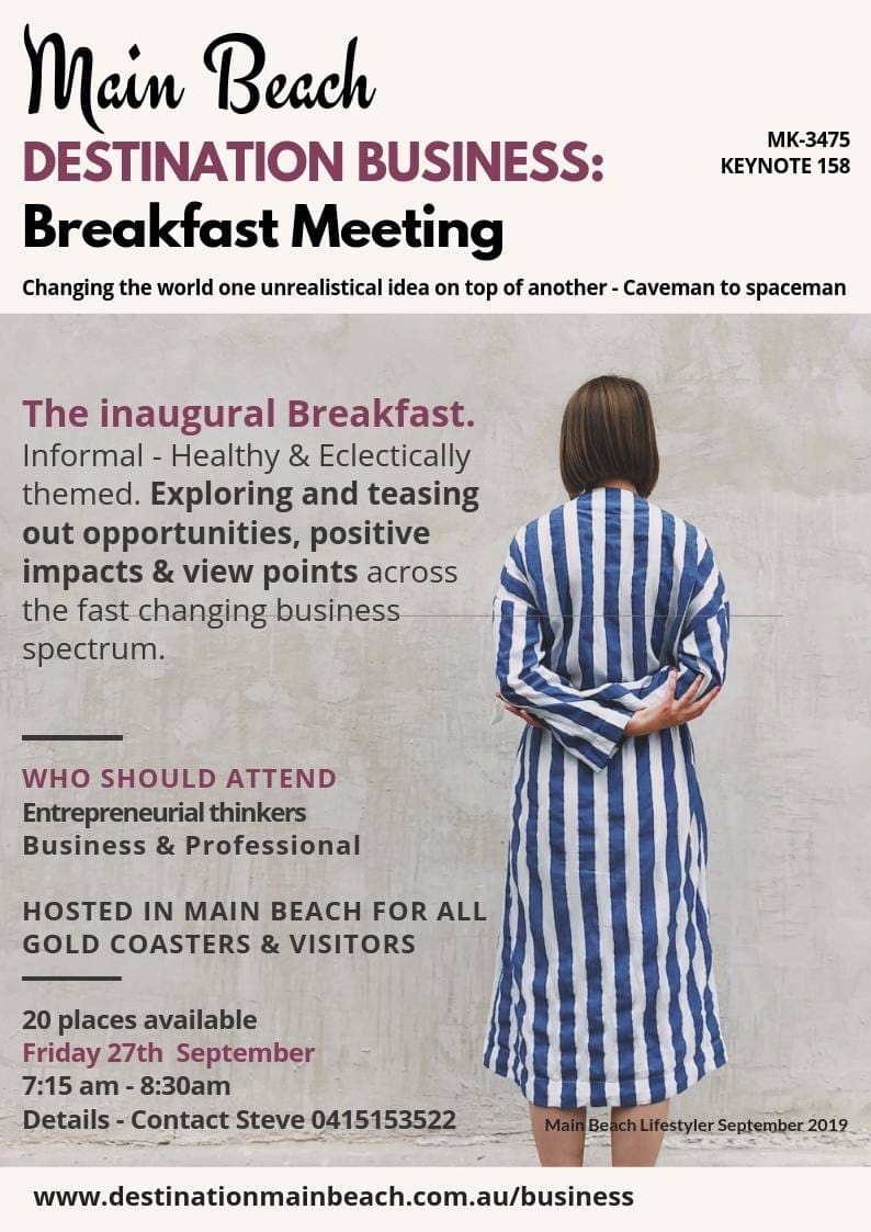 These breakfasts are Main Beach themed and hosted with a focus on welcoming the world outside Main Beach to our breakfast table ambience. So if you are a new resident or visitor please join us as we lean into a fast changing fusion of business, entrepreneurialism and lifestyles – be warned this is not the normal or stuffy biz breakky type arrangement.